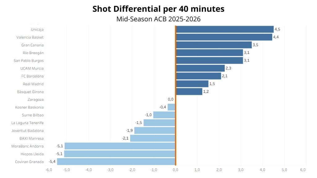 Unicaja and Valencia generate roughly +4.5 shots per 40 minutes more than their opponent. That is substantial. Over a full season, it compounds into structural separation.