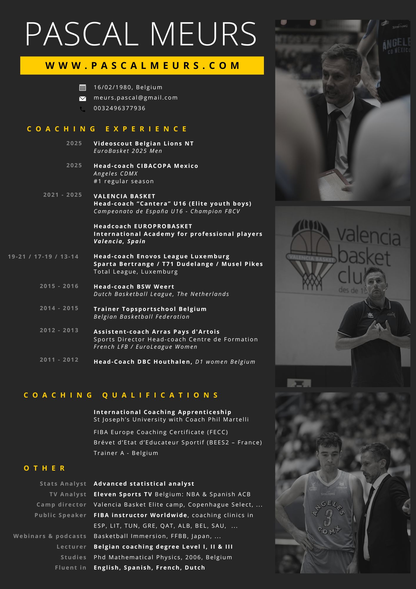 Previously, he developed elite youth talent at Valencia Basket in Spain and served as the head coach at EuroProBasket, an international academy dedicated to shaping future professional players. His coaching career spans the top leagues in Belgium, the Netherlands, France, and Luxembourg.
